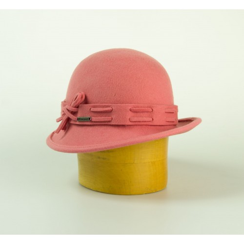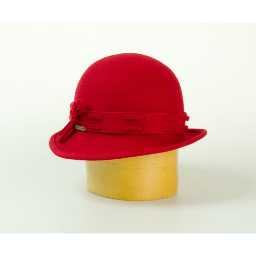Dámský modelový klobouk zdobený proplétaným páskem z vlny a plíškem