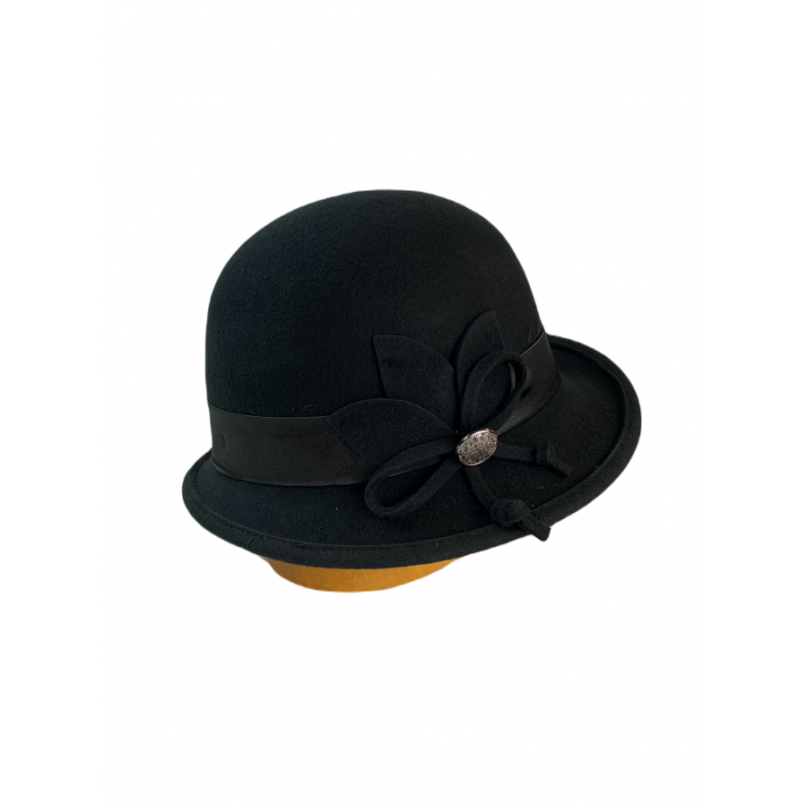 Dámský vlněný klobouk zdobený saténem a knoflíkem .