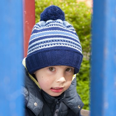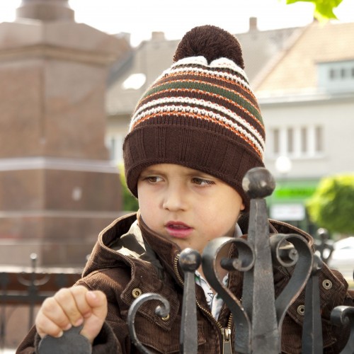 Dětská pletená čepice pruhovaná s jednobarevným ohrnovacím rantlem a bambulí.