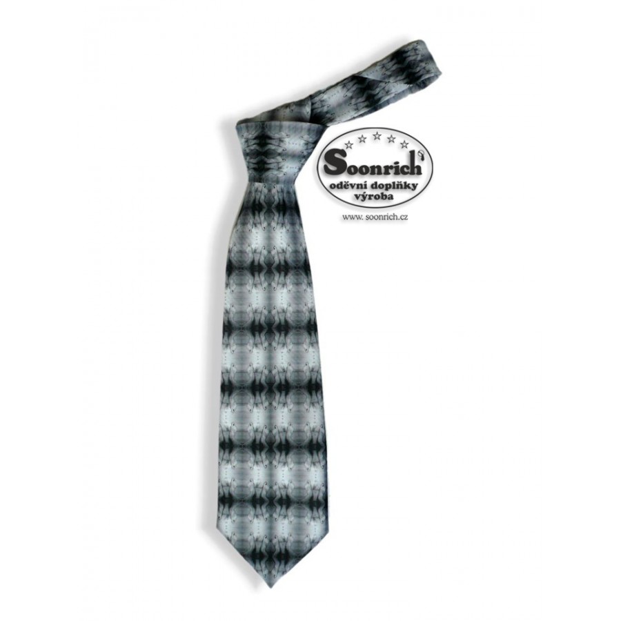Pánská kravata je ručně potištěná vlastním originálním motivem. Dezén kravaty může být natištěn jak na hladkém nebo tkaném materiálu s geometrickým
