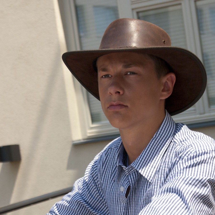Kožený kovbojský klobou z Austrálie zvaný "australák" Velice kvalitní materiál z australských býků, UV filtr 50, voděodolný..Tento klobouk je velice oblíbeným a slušivým doplňkem pro pány i dámy.